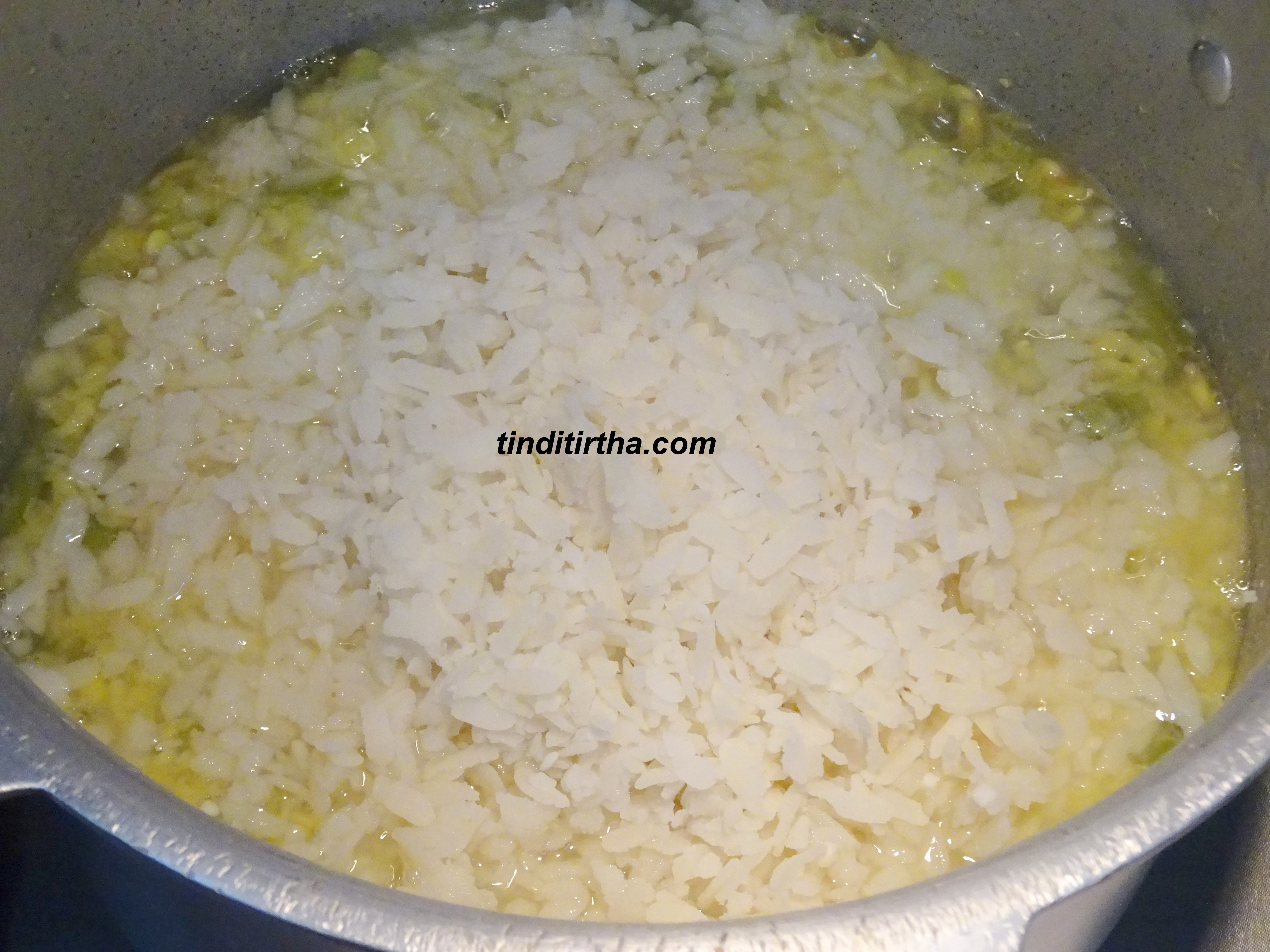 • Cook together split green gram and mixed vegetables using enough water in a cooker or vessel